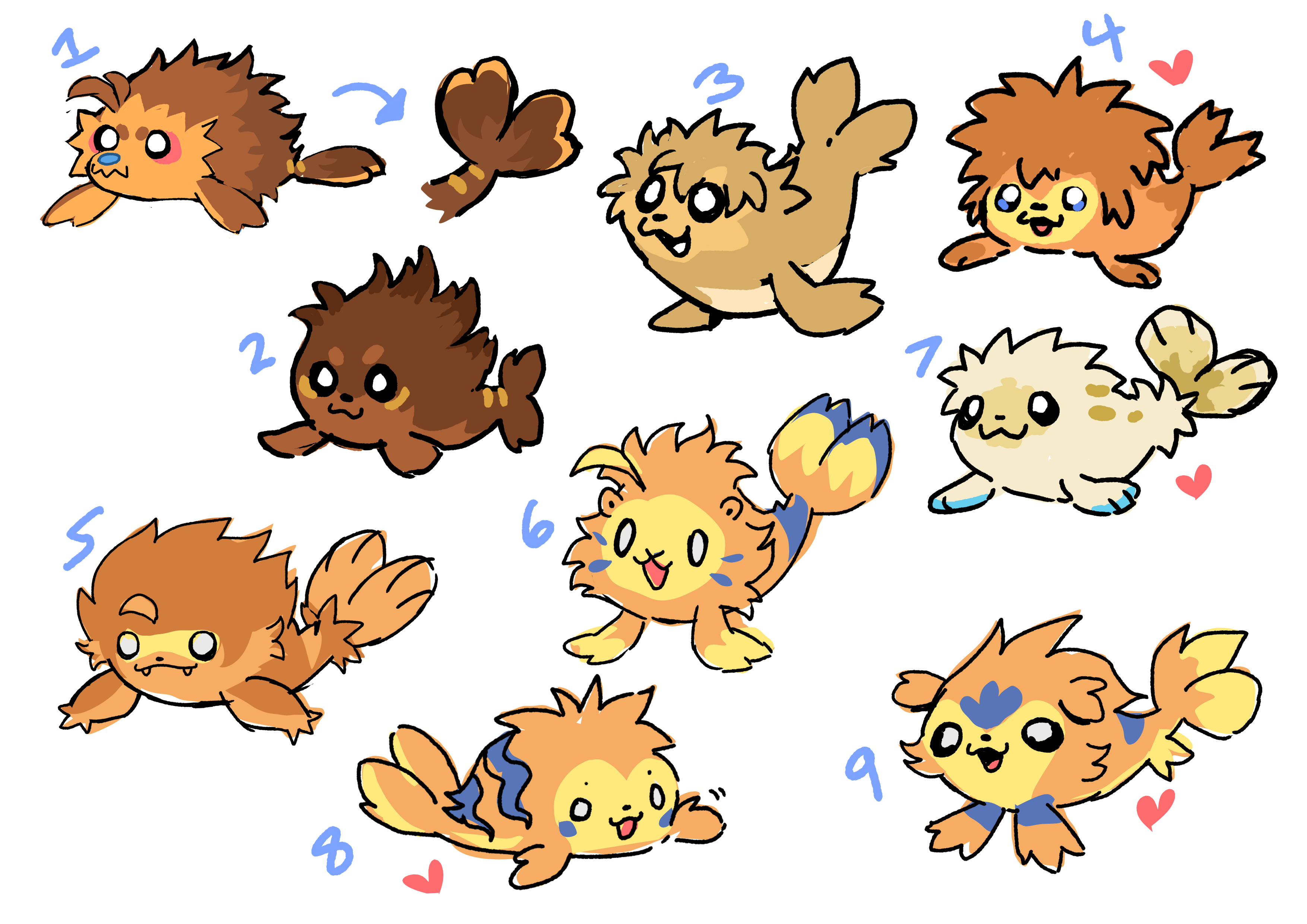 This is probably a great time to mention that Irischroma loves pompadours. I don’t know why, I don’t think there may even be a particular reason. But left to their own devices, Irischroma would often introduce a pompadour somewhere in designs they played with, sometimes even accidentally. And that is what came through here in their development of the beach bro seal, including a first sketch idea for an immature form based on them. Looking at the adult’s sheet, I couldn’t find anything wrong with the designs, and in fact I was really excited by the strong personality already coming across, so I felt that it was basically finished and ready for animation. These are the sketches we used in beta builds for years. But while Alexis loved the personality and poses, she had doubts about the design, so we paused further work on its concept. After a while, feeling like we needed to make some progress on it somehow, we decided to explore more ideas for the immature stage.
