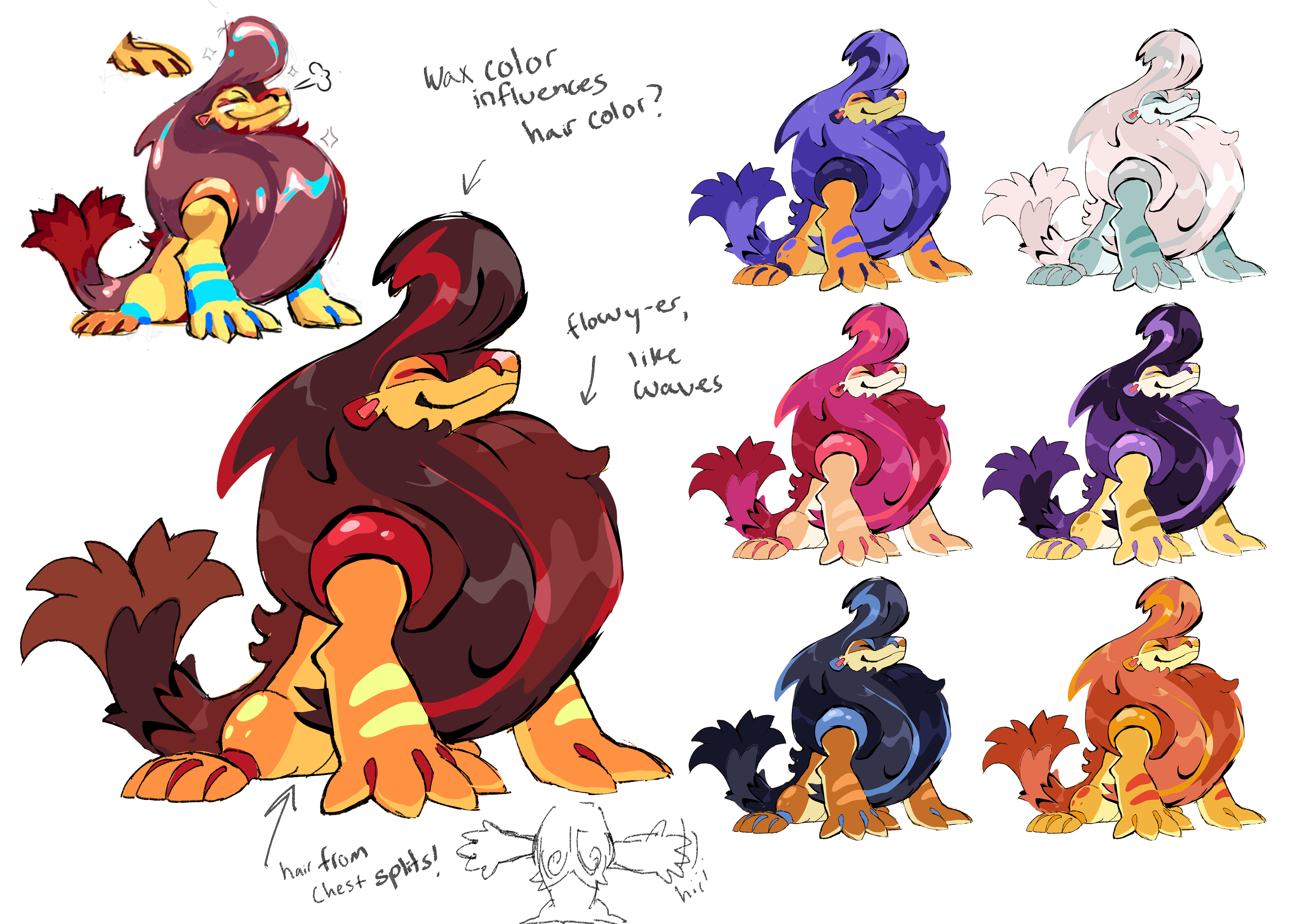 Iris ran with this, playing with more hair shapes and color ideas, iterating on what Alexis had started. This was where we nailed down specific details like the size and shape of the hands, the patterning in the hair, the design of the tail, etc. We worked out that using the wax color as a hair highlight/streak felt strongest way to showcase that detail. The largest struggle remaining was trying to nail the texture of the hair, which had to look like hair, but also unnaturally smooth and shiny, all without compromising the level of detail established by our art direction.