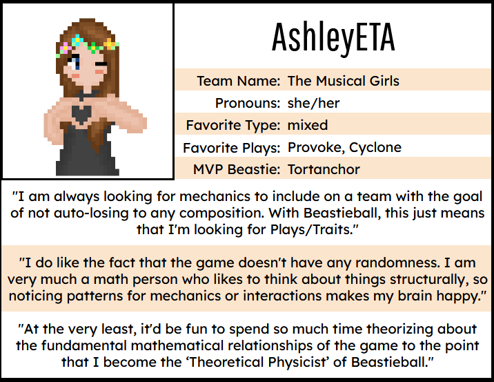 Congratulations to these coaches! Many of these players are active in our community Discord, often swapping strategies and team ideas. In fact, kim of the Happy Hearts (this Bash’s #2 player!) recently took it upon herself to start interviewing active community members to learn more about their angle on the game and teambuilding. Here’s a little bit of insight from some of the above coaches…