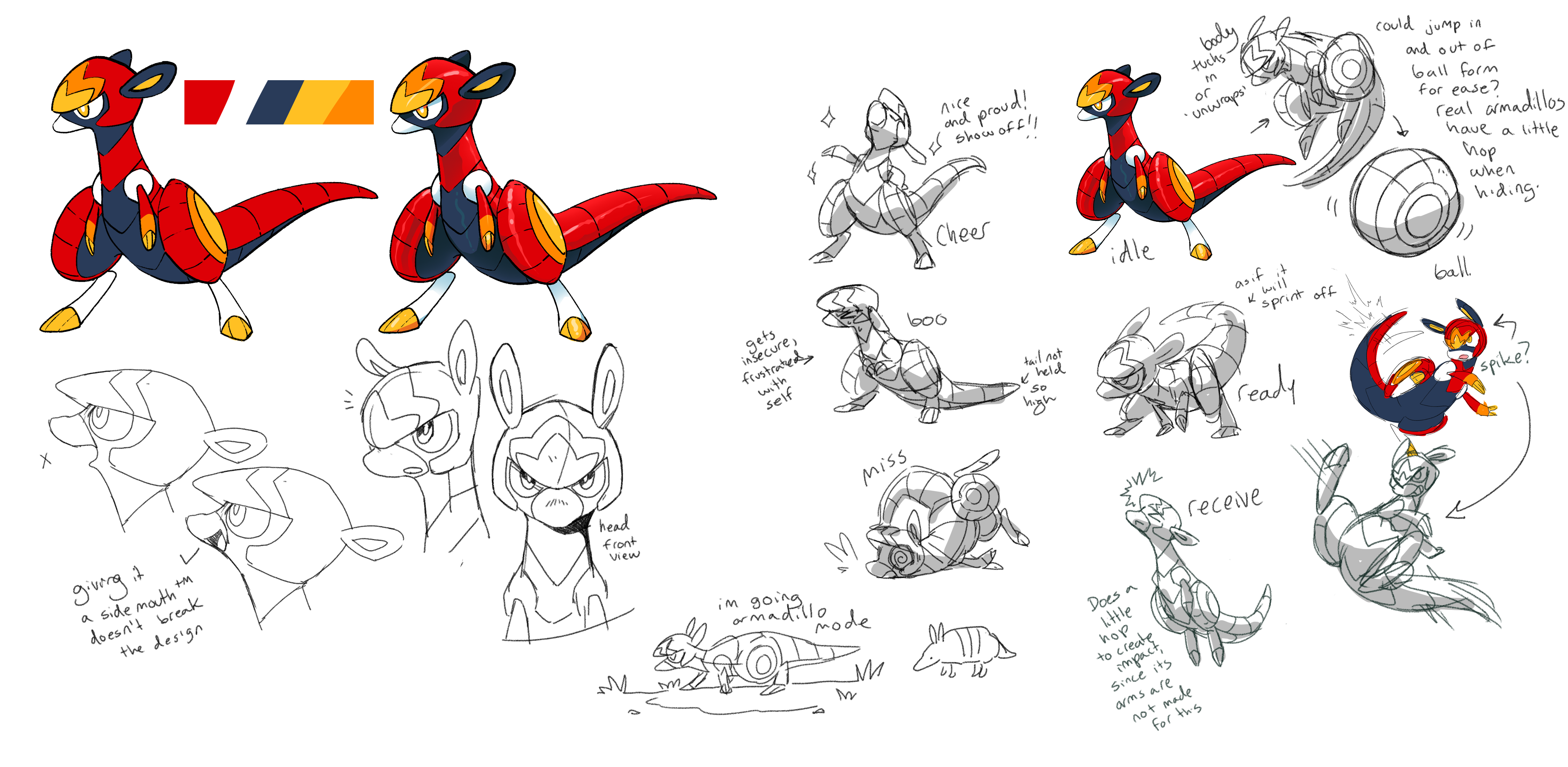 So when Tia Rohrer (AKA Irischroma) joined the team, one of the first prompts we sent them was a ‘spirited’ Beastie, who focused on spirit power and powering themselves up, including the ability to summon an audience via a play called Rally. Iris always had an explosion of ideas for every prompt, and this “fiery” armadillo was just one of many that they tried for this concept which we decided to pursue further because it was so darn cool.