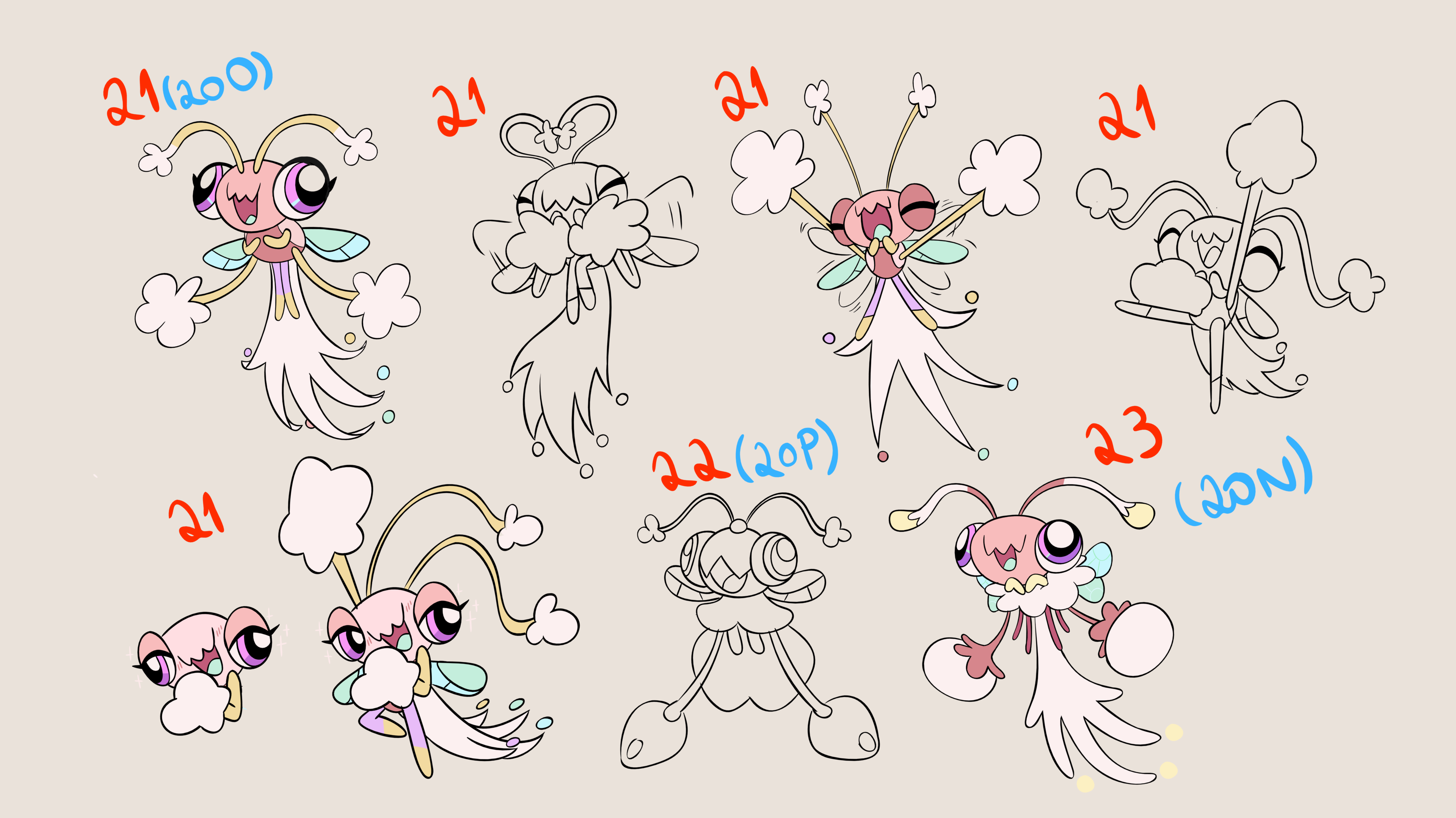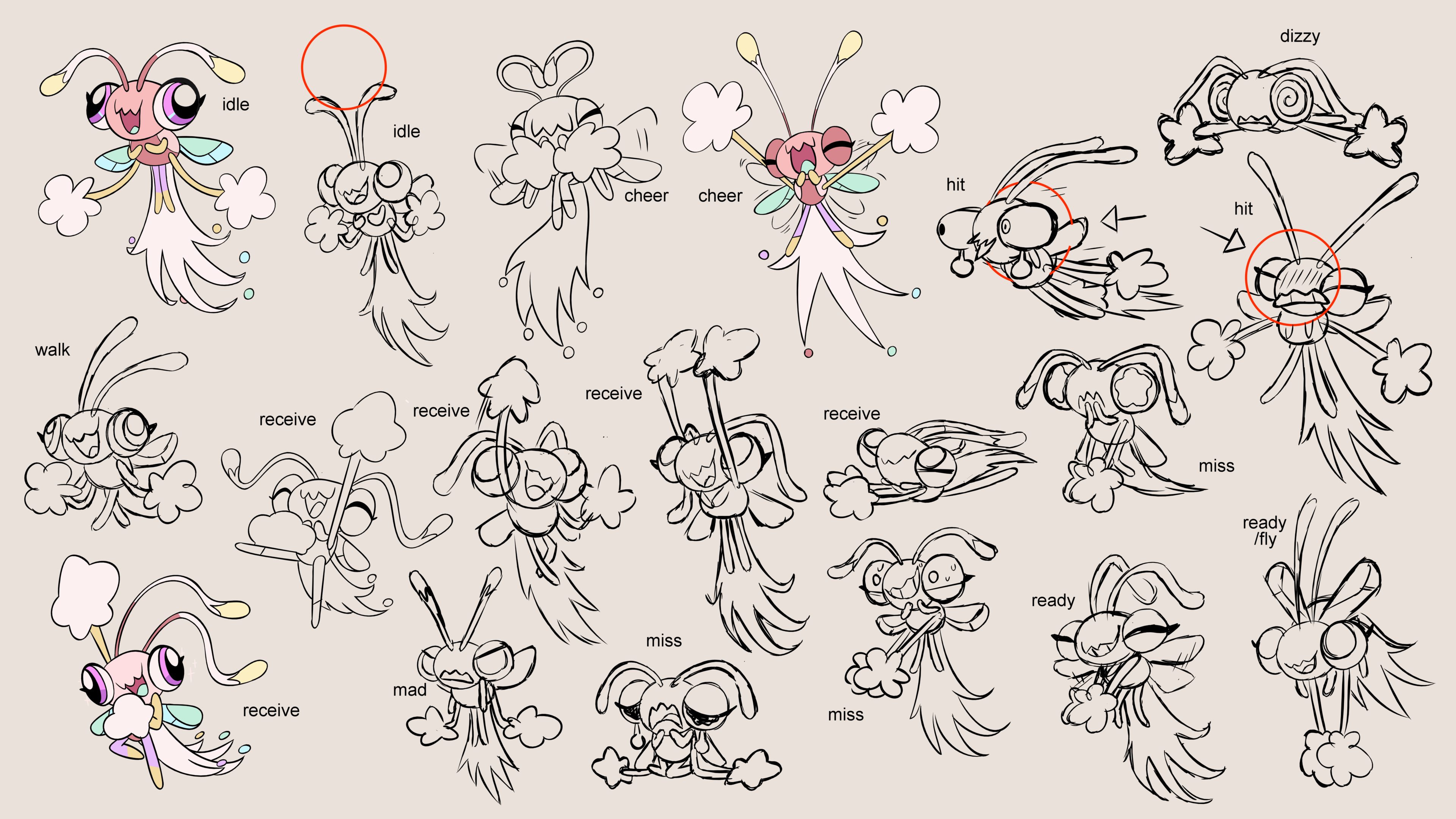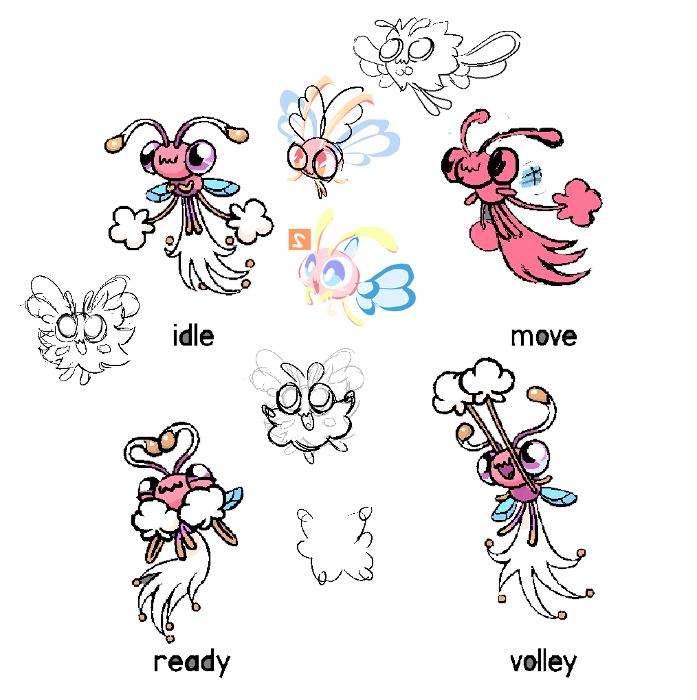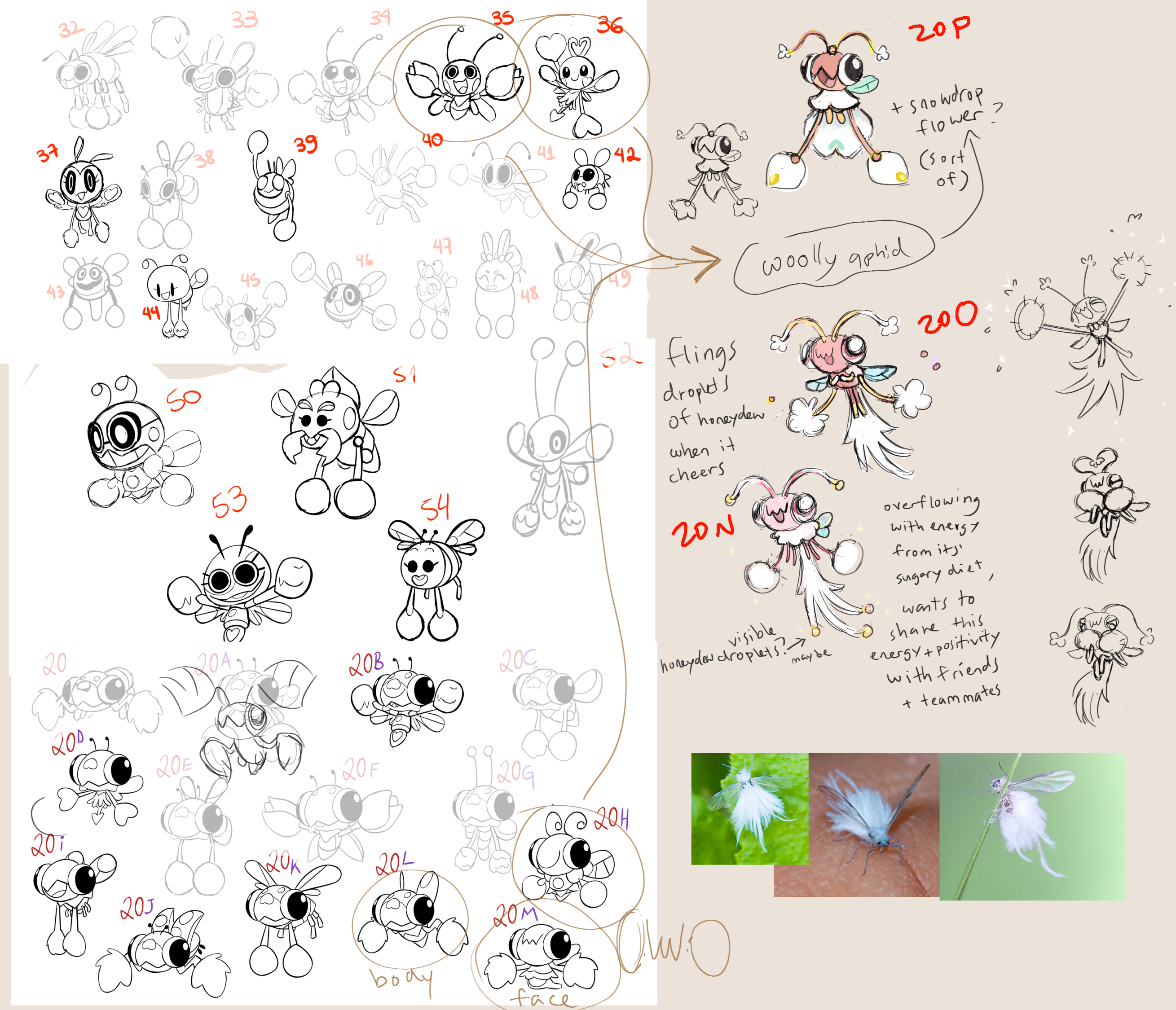 This was what Alexis came back with after a period of contemplation, and right away we could all feel that it had been “solved.” She chose to focus on woolly aphids, very small bugs who suck sap from flowers and spin it into a cotton-like cloak. The idea to reframe this as a cheerleader pom was pretty galaxy brain, not to mention the way she navigated Ivan’s ocean of ideas to bring together many of the most appealing individual details — the OwO face from one drawing, the head/body ratio of another, the use of long, gangly arms and dangly shapes from yet another. Where the rest of us had been stuck deciding which design to explore more deeply into, Alexis found a way to pack all of Ivan’s iterations into one!