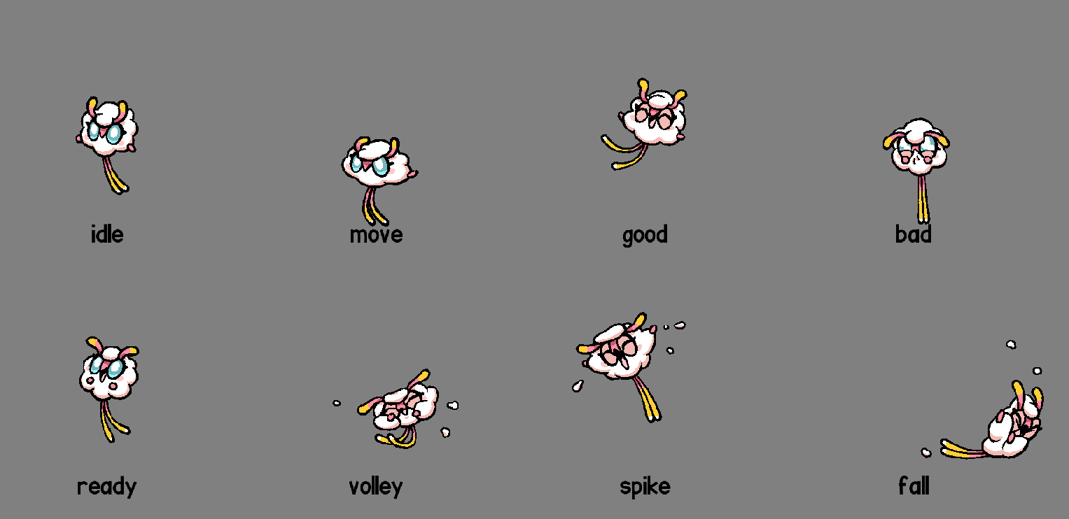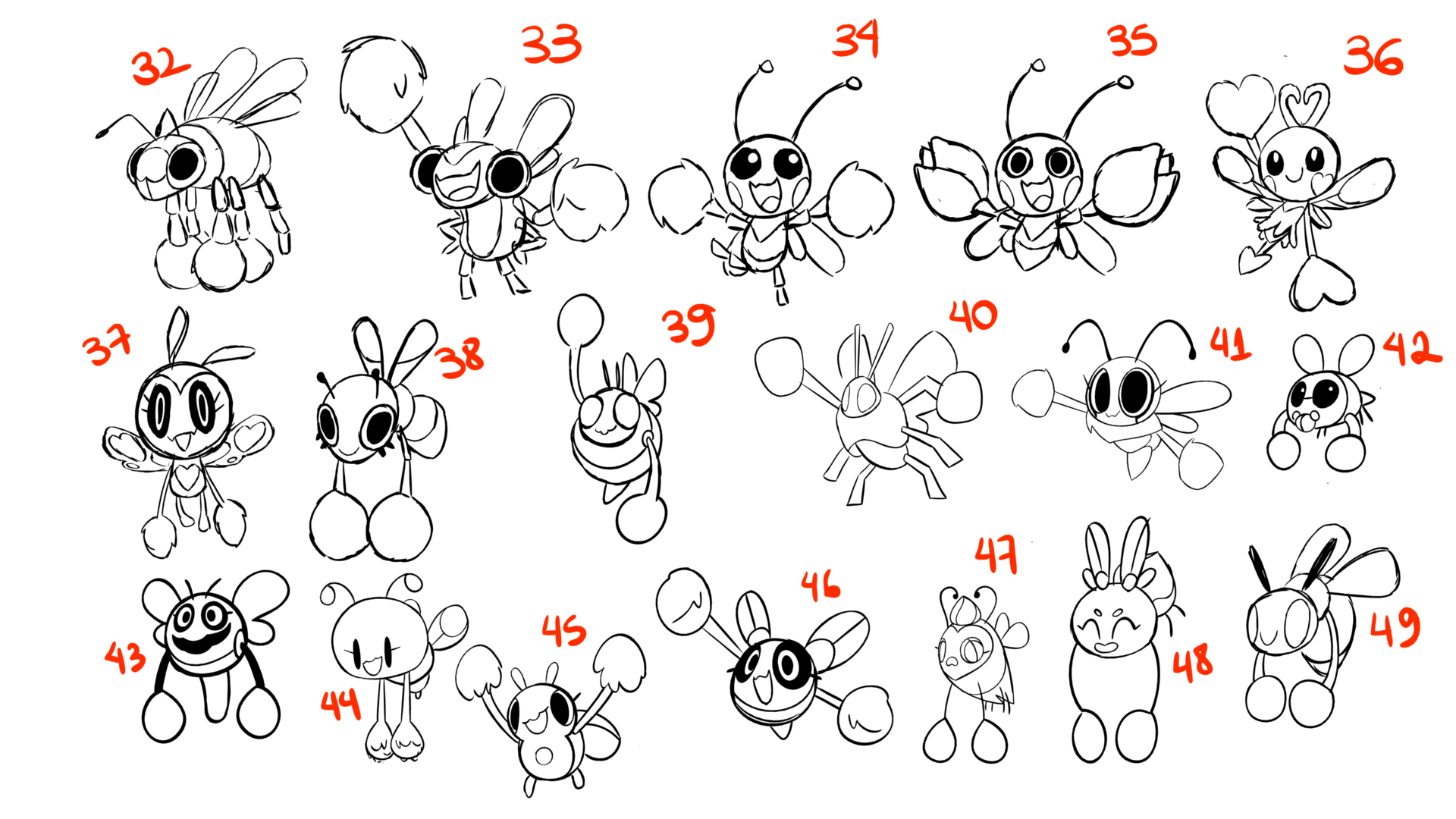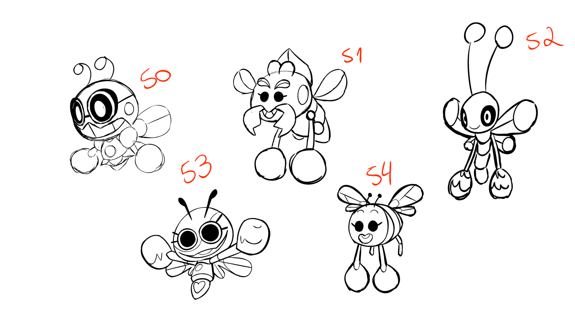 This was what Alexis came back with after a period of contemplation, and right away we could all feel that it had been “solved.” She chose to focus on woolly aphids, very small bugs who suck sap from flowers and spin it into a cotton-like cloak. The idea to reframe this as a cheerleader pom was pretty galaxy brain, not to mention the way she navigated Ivan’s ocean of ideas to bring together many of the most appealing individual details — the OwO face from one drawing, the head/body ratio of another, the use of long, gangly arms and dangly shapes from yet another. Where the rest of us had been stuck deciding which design to explore more deeply into, Alexis found a way to pack all of Ivan’s iterations into one!