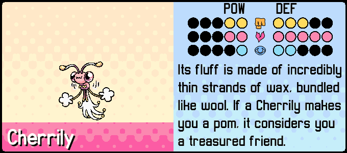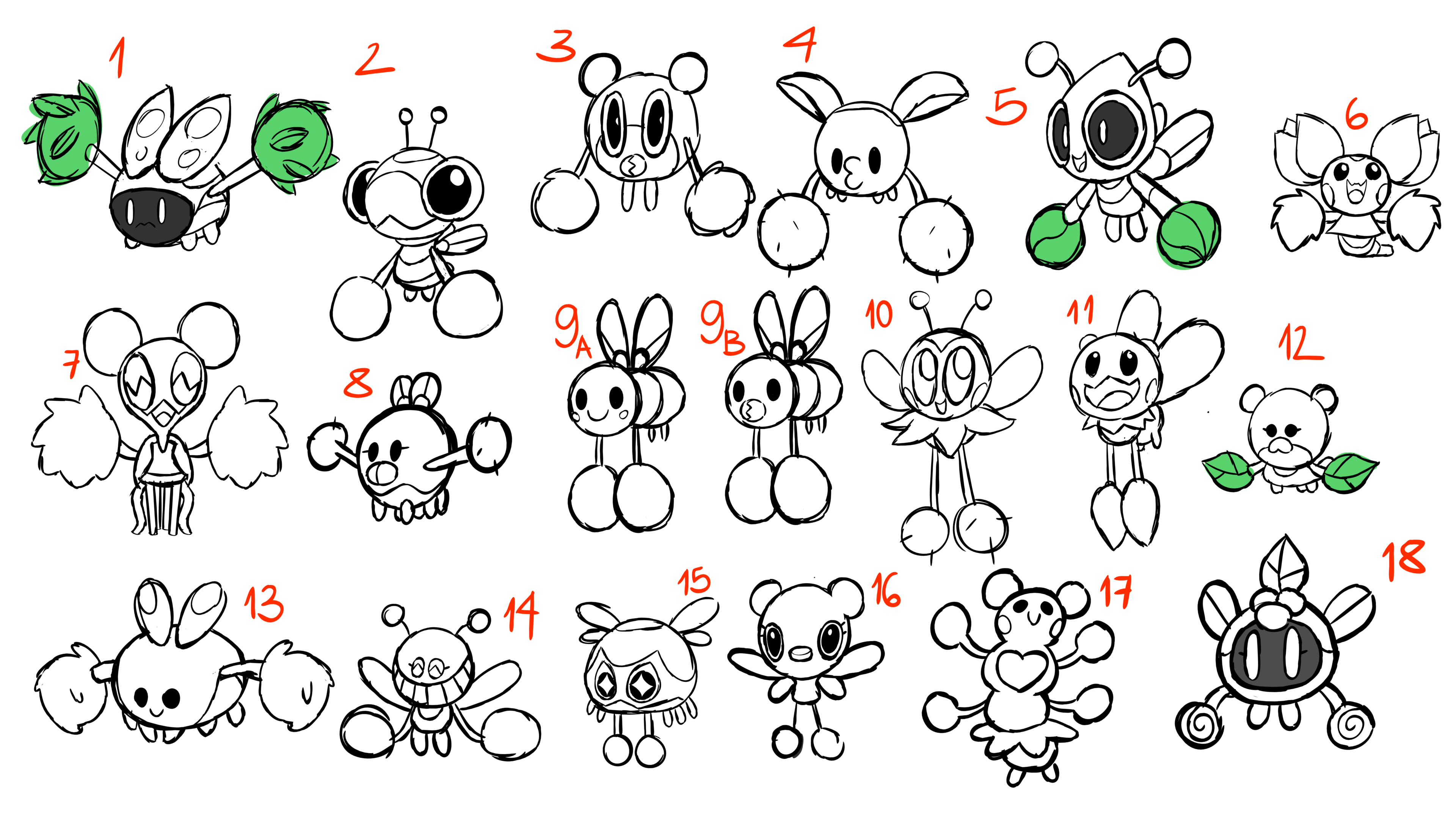 We knew from early on that we’d want to make an immature form for Cherrily as well, since it seemed so straightforward to take the design and make a cute baby version of it, possibly even drawing from Ivan’s existing body of sketches. Eventually, Irischroma decided to pick up the torch and take some passes on the idea.