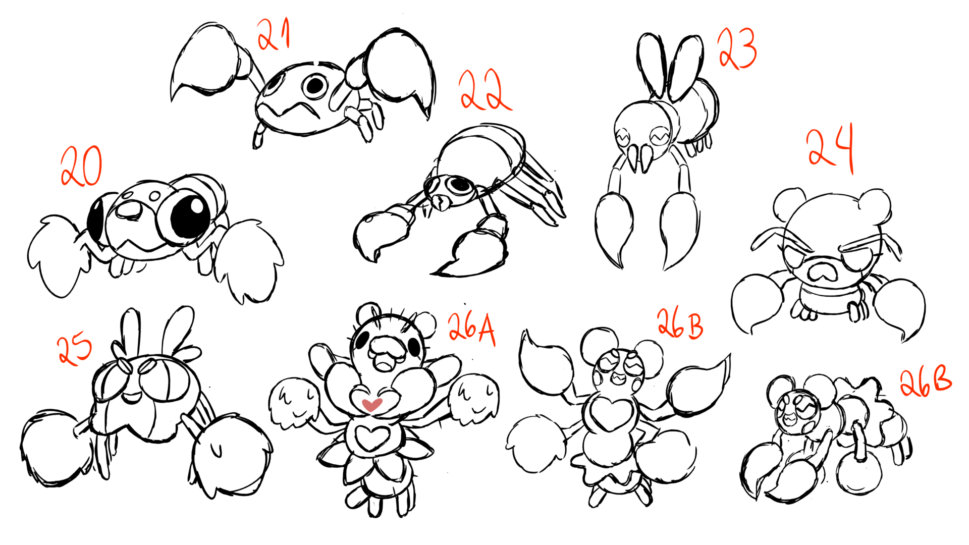 As we advanced through sketch phases, something we wanted to emphasize were more elements inspired by specific insects, trying to create something that felt more naturalistic and less caricatured/cartoony, the way Ivan’s style bent. Ivan’s jolly character designs all had the right energy, but Alexis soon realized we needed some way to filter down all of the ideas into something cohesive. She wanted to find some single specific bug species that we could center the design on, using elements from Ivan’s sketches to inform the character. In our search for possible pom-pom wielding inspirations, we considered pseudoscorpions and even pom-pom crabs.