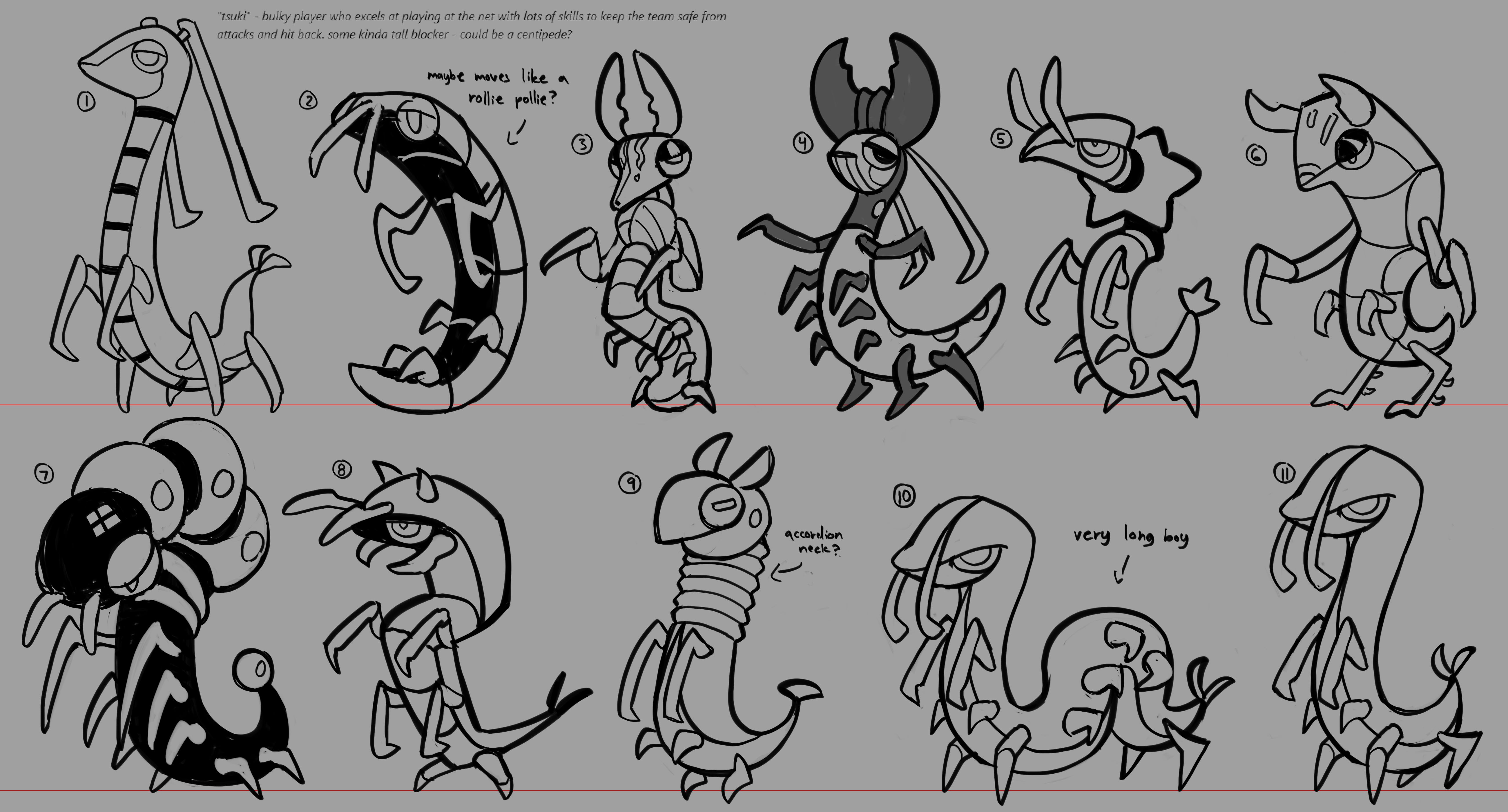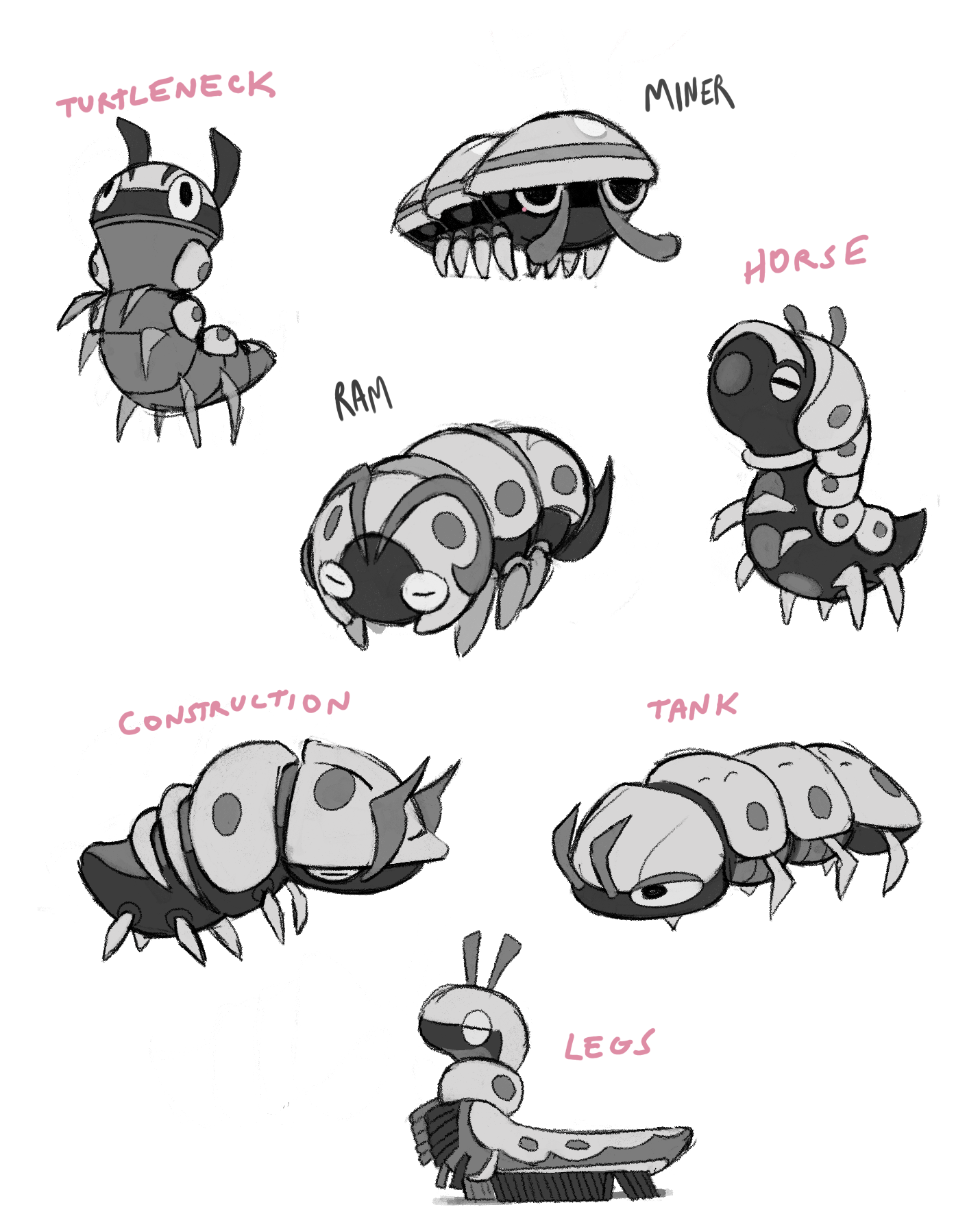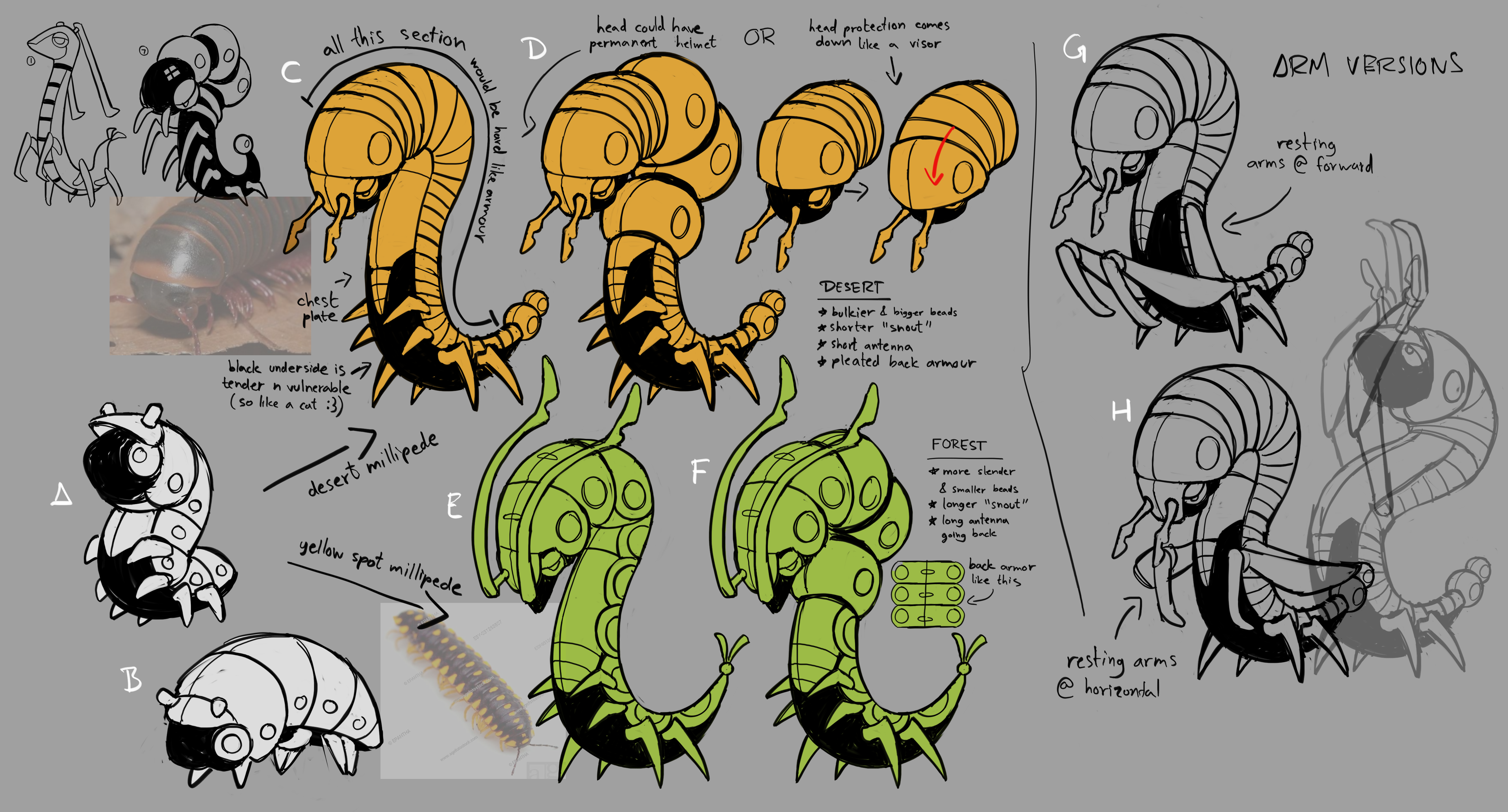 Enter Harlow Diggs, whose past experience with entomology had proven a strength on our team time and again. She identified pauropodas as a potential insect to draw inspiration from and offered a few ideas, and shared some very old sketches she’s done trying to adapt the same insects before. There were tons of ideas here with great appeal. But without any theme tying the ideas together, nothing really felt like it had any connection to the tall millipede they were based on.