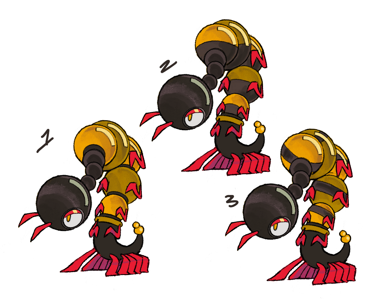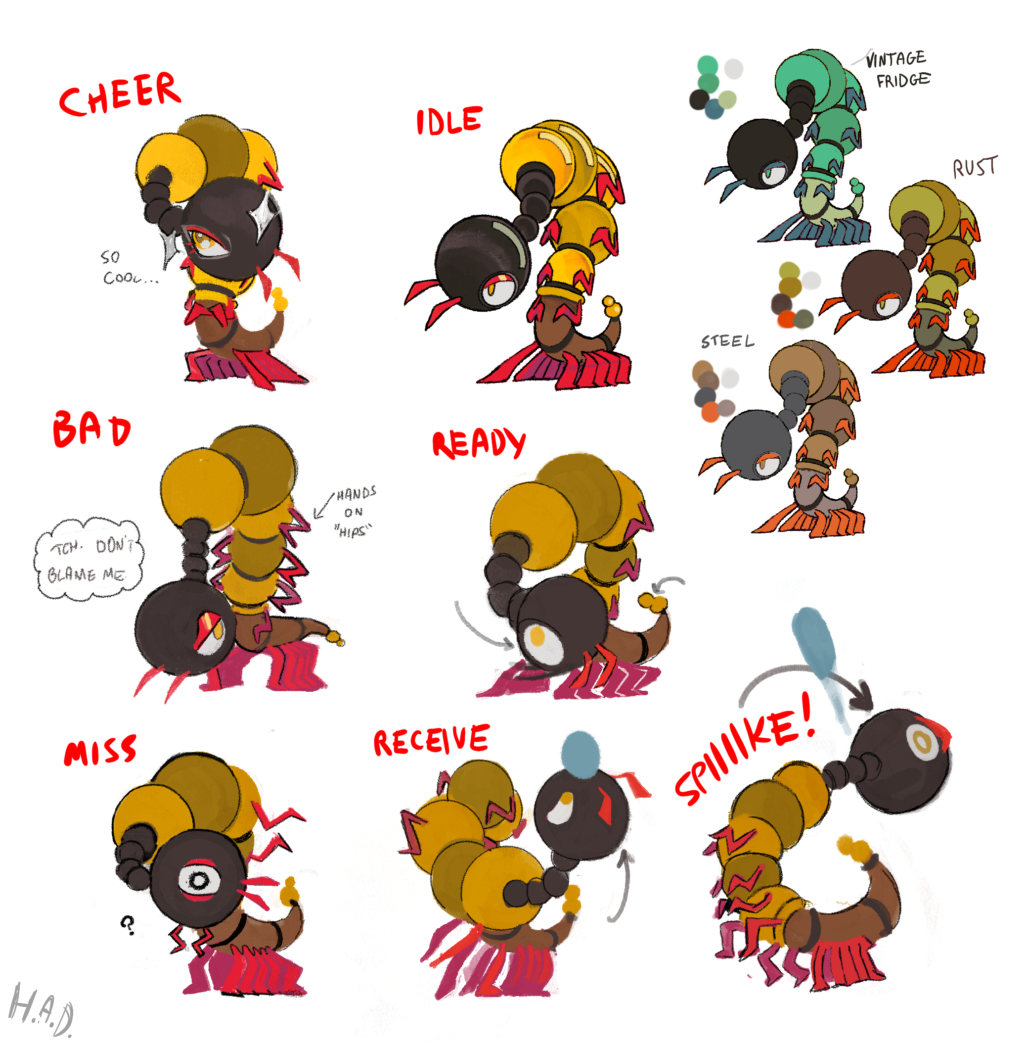 I don’t know if the idea clicked for the rest of the team, at least at first, but all the pieces snapped into place once we saw the designs side by side. Harlow pushed into yellow-and-black for the color palette, emphasizing the “construction” theme and codifying this Beastie’s in-game role as a Body type. Somehow, we’d found a way to explain the bizarre shapes of Karen’s original concept, injecting a theme into it without disrupting what had made it so appealing in the first place. It was a huge win. This was where Alexis suggested that we augment the immature form’s antenna to take inspiration from dirt pushers, to solidify their role as an earth-mover that teamed up with the wrecking ball adults.