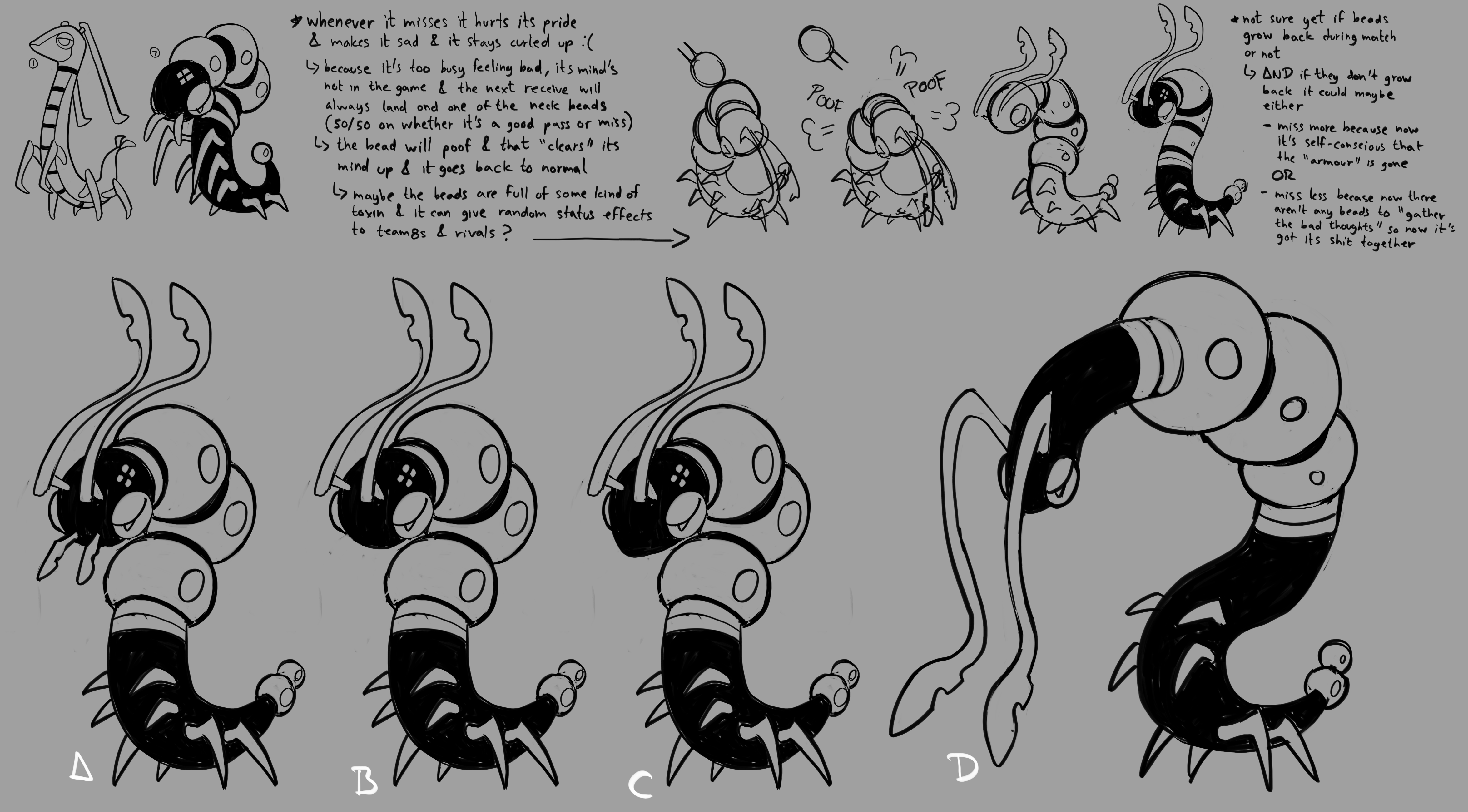 Karen tried a lot of ideas, pulling from any inspiration they could find. We honed in on some species of pillbugs as potential real-world inspirations. But nothing was quite working. We really, really liked the original silhouette from “design 7” (Alexis particularly). But we couldn’t come up with any explanation for it to have those strange, distinct spherical shapes on it. And every alternative idea and shape that Karen explored to help it feel more grounded seemed to compromise the original drawing’s appeal. We couldn’t find a way to resolve it.