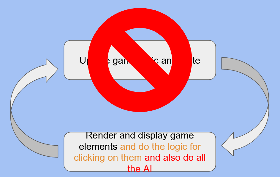 To explain the first and weirdest detail of how the AI is written, I need to briefly explain how games are generally programmed. Essentially, you break every step of the computing process into two main phases - updating the game state, and then rendering that state to the user.
