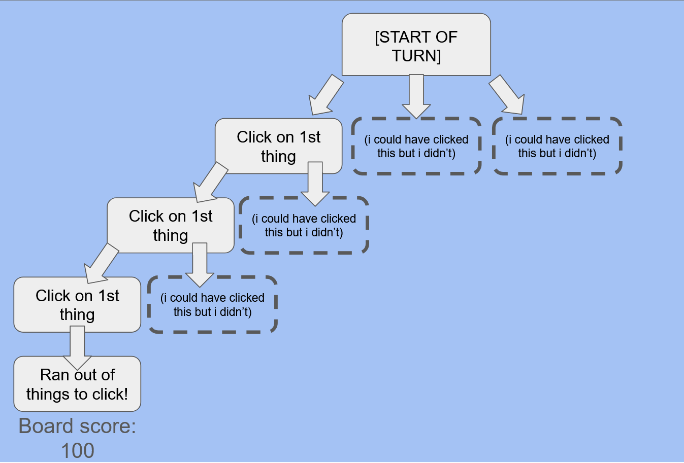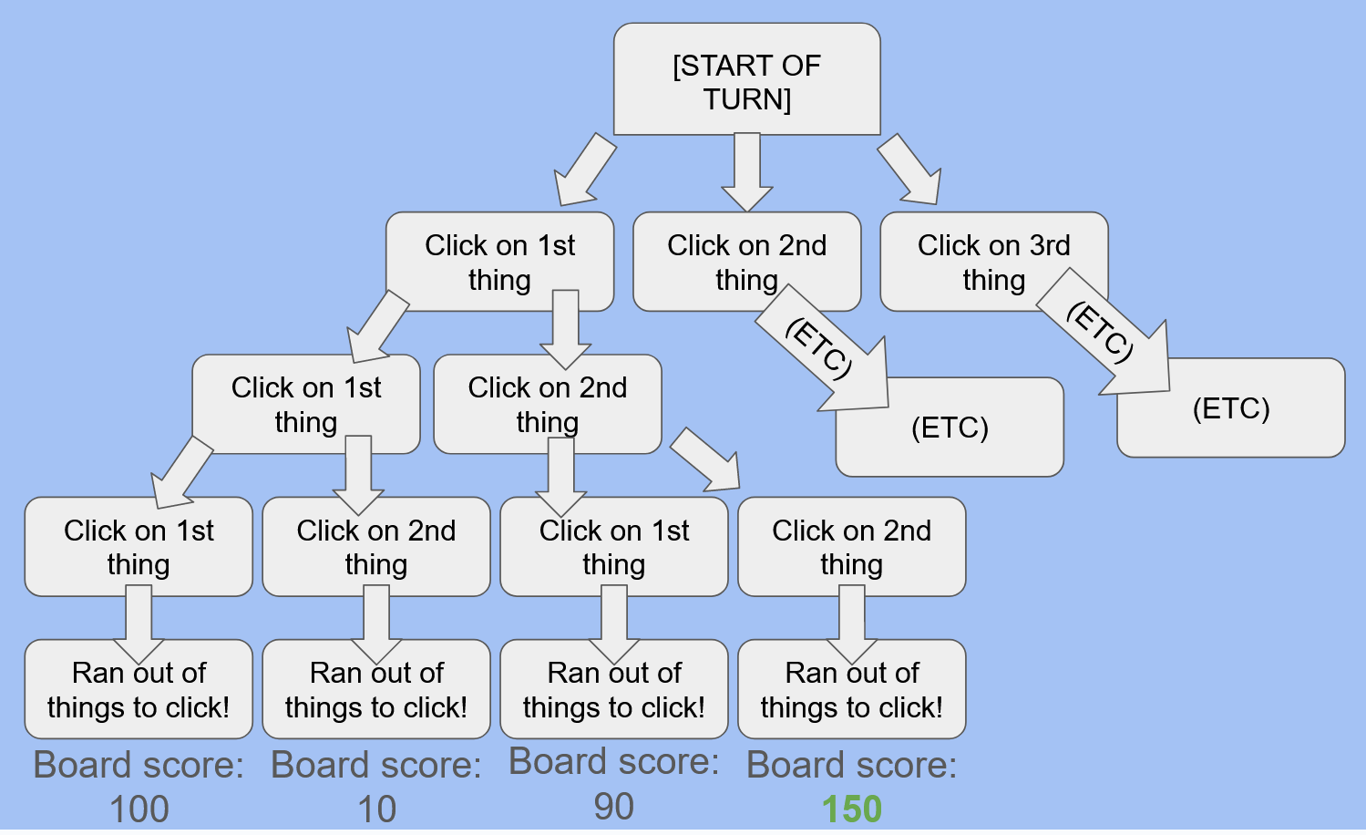The AI then goes back to the start of their turn and starts over, repeating this process ad nauseam until it has clicked on everything it could ever click in every situation, and has assigned a score to all possibilities.
