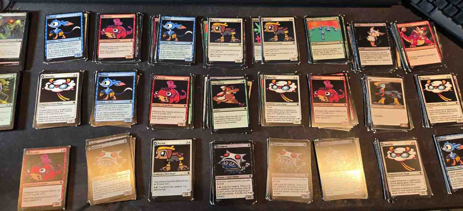 If you're curious to browse the full collection of cards, you can see Zonk's original PDF here! This comes with an extra guide for the 2 keywords Zonk created. And if you ever want to actually draft and play with these cards, then Sarah helpfully shared the PDF she made to print them, which includes multiple copies of different cards based on their rarity. I know I'm biased, but it's surprisingly well put together, and the DIY vibe/creative mechanics added a lot to our fun in learning this set together.
