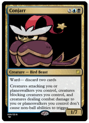 Although the card art is a mix of hasty screen grabs and asset rips from the game, the game mechanics and designs are all very thoughtfully done. Every Beastie's card faithfully recreates how that Beastie feels to play in Beastieball; some cards translate mechanics straight from the source while others, like Webbounce above, playfully use Magic mechanics to express the personality of the Beastie in completely original ways. I'd compare it to the way Super Smash Bros. successfully adapts characters from many different games and genres to all compete in a fighting game without losing their individuality. As a creator, this kind of "design" fan-work is really flattering and novel to get to see... you can tell Zonk deeply understood and cared about how each Beastie "felt." Their background as an active Beastieball PvP player definitely contributed to that understanding!
