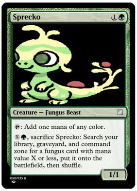 The deck I wound up building was a 5-color deck built around Sprecko. Typically in Magic, you'll focus on 1 or 2 colors for your entire deck, which allows you to specialize and have all your cards share common energy. 5-color decks are kind of a meme that are challenging to actually make progress with. But a lot of the "main characters" in Beastieball had been designed around a 5-color theme, something I picked up on quicker than other players (...because I knew they were "main characters"), so I decided to gamble on building for it and trusted that Zonk would have left all the tools I needed somewhere in the set. The deck I wound up building was still pretty much a meme deck, but it was very fun to pilot. My skill issue was a limiting factor... it took me several games to understand how my drafted cards were best played. The combo I eventually discovered involved chaining Spreckos to spawn a god-monster from anywhere in my deck in just a few turns. I ultimately lost more than I won, but some of the wins I took were strikingly fast and decisive, even against much smarter opponents.