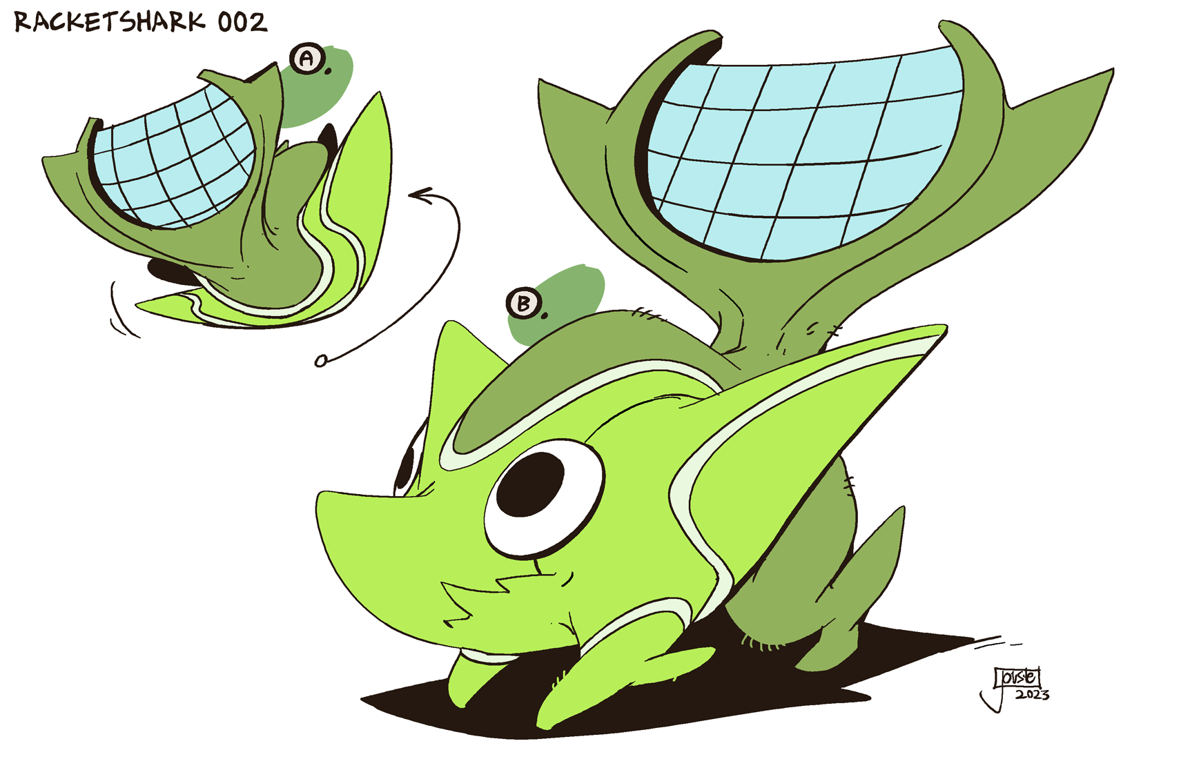 The large shark was based on thresher sharks, which use their tail to create underwater shockwaves (incredibly cool). Alexis imagined the tail as a massive implement that could thwack the ball super hard, and then drew up a cute little baby version to go with it. I found some process drawings for the little shark, who we called Shuppy: