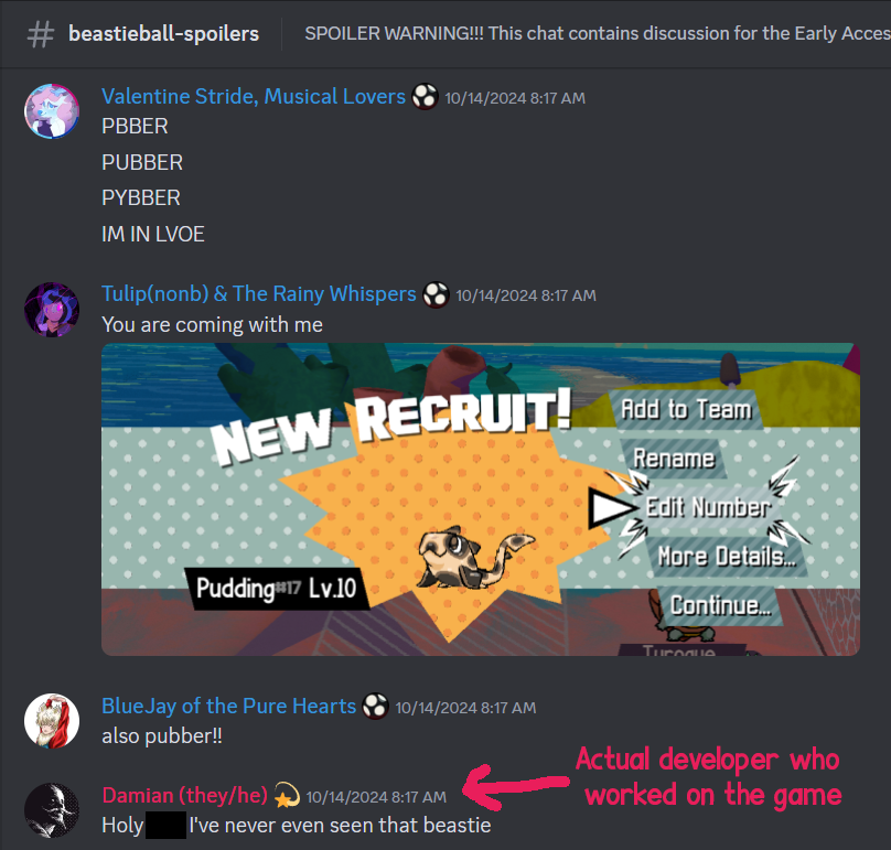 This cute design was inspired by land-walking Epaulette sharks, with patterning that rode the line between “Epaulette shark” and “dog.” To solidify the theme a bit more, I suggested shifting the colors to look more like a Beastieball (spotted black and white), with the idea being that they’d be a ball-mimic Beastie. This felt like a solid foundation to build on, but this conversation was happening only hours before Playtest 3 released. We got the updated art in with only minutes to spare, before anyone else on the team even knew we’d done it. It felt like we’d dodged a bullet!