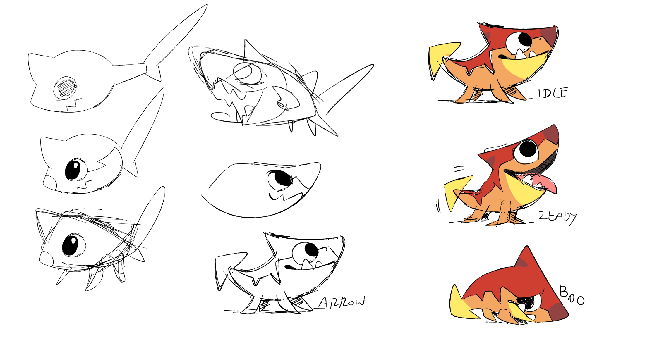 Before we knew it, Playtests were coming out, and we’d soon be debuting the Chroma Sea area to players with no final shark design. At the eleventh hour, while sick with Covid, Alexis locked herself in a room and drew shark babies searching for some idea that was going to work. That’s when we got these drawings: